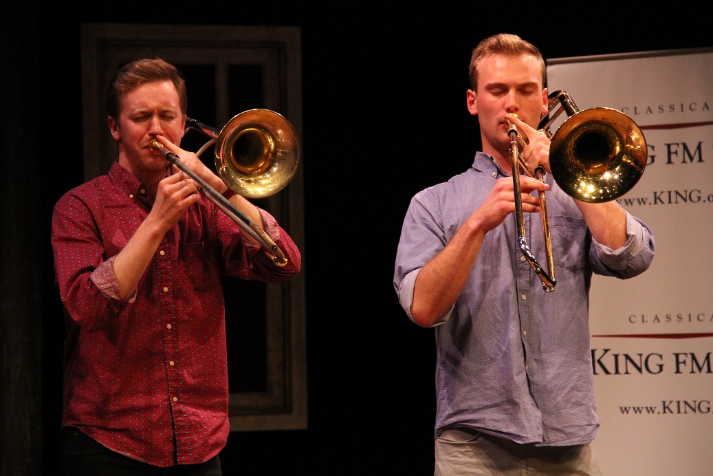 Trombone playsers Andy Clausen and Willem de Koch. Published June 6, 2016 at 1037 × 692 in PHOTO GALLERY: Second Inversion Showcase at NW Folklife Festival